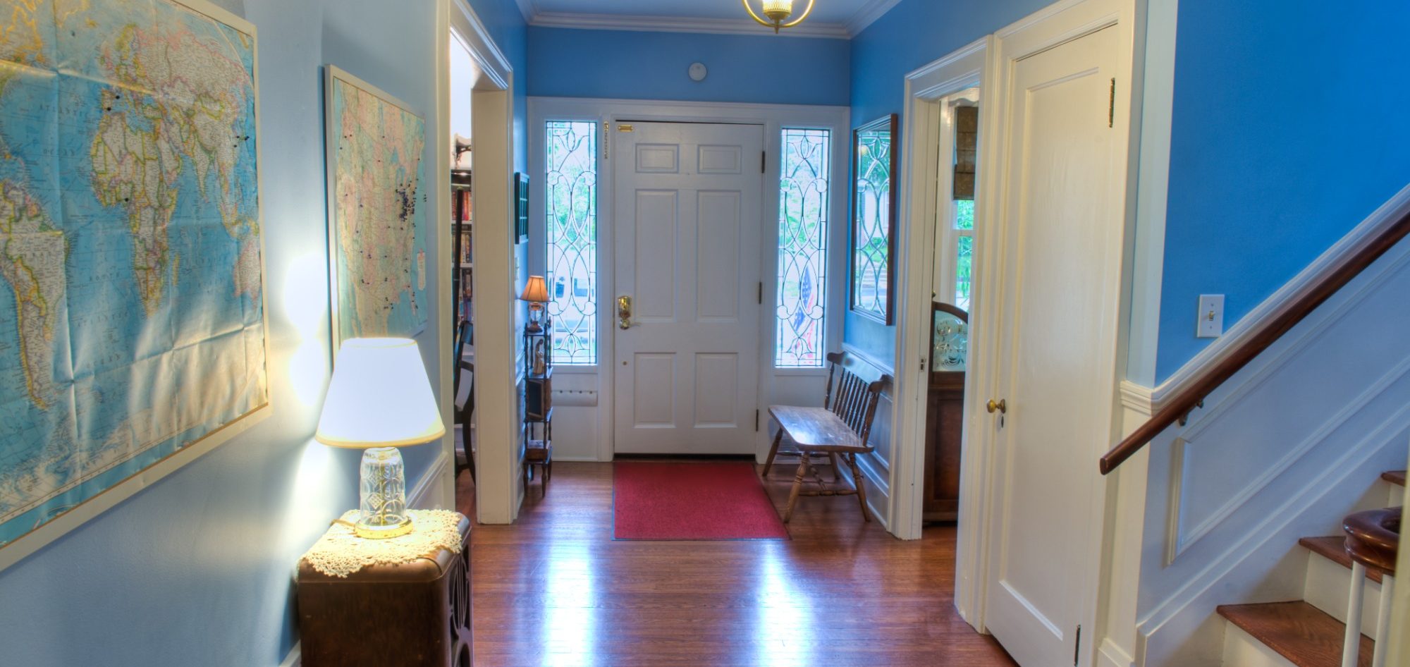 Our home is a spacious Colonial Revival American Foursquare. This truly American house style developed in part as a reaction to the excesses of the Victorian era, and featured plain, efficiently laid out floor plans. Our Foursquare was built around 1910 and featured closets and large windows in a relatively compact cube. While most Foursquare homes have a large porch covering the entire front of the house, ours was substantially renovated in 1951 to become a "Colonial Revival" style Foursquare house. Instead of a large covered porch we have a smaller porch, almost a stoop, with wrought iron railings. The color scheme is white with black shutters, with other "colonial" touches inside. The most common reaction to people who tour the house... "It's bigger on the inside!"